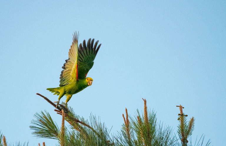 Bis auf eine kurze Sichtung der Gelbkopfamazonen blieb unsere Suche erfolglos. Aber Marcus versprach mir, dass wir sie kurz vor Sonnenuntergang noch an ihrem Schlafplatz sehen werden. Wir kamen an den Eingang zum Schutzgebiet. Eine Wachstation und zwei Aussichtstürme standen hier. Nun warteten wir wieder. Marcus kletterte auf den Turm. Es dauerte nicht lange und zwei Amazonen kamen angeflogenen und landeten weit oben in einer Pinie. Ich versuchte, zu ihnen durchzudringen, aber zu viel Geäst versperrte mir den Weg. Nun waren weitere Amazonenrufe zu hören und Marcus rief nach mir. Bei ihm auf der Plattform, fast direkt neben ihm, sind vier Amazonen gelandet. Nun war ich baff. So nah am Menschen, wie kann das sein? Marcus war etwa einen Meter von ihnen entfernt.